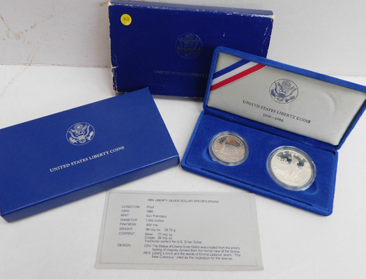 'USA 1986 Ellis Island two coin silver proof set with paperwork'