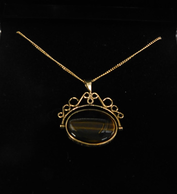 '9ct Gold chain with 9ct spinning fob pendant set with onyx/tigers eye - 6.4g'