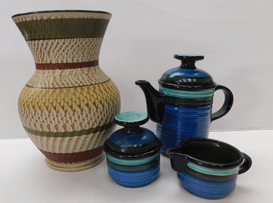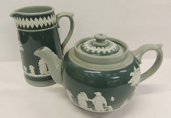 'Antique Dudson Bros Hanley green Jasperware jug (17" tall) and Teapot - stamps to base'