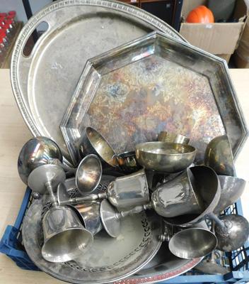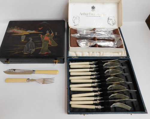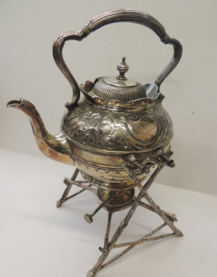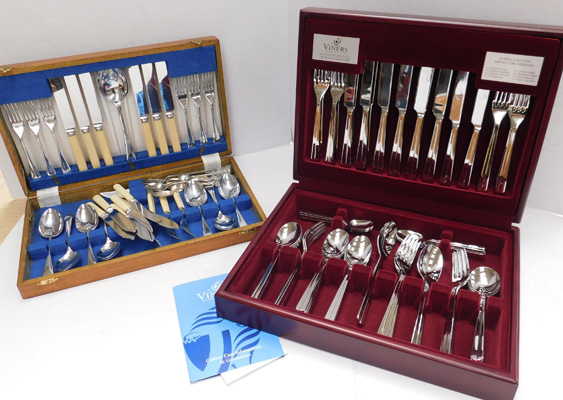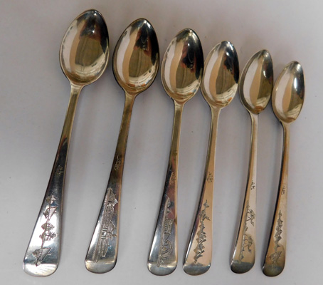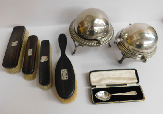 'Silver spoon in case; Sheffield, plated ware and monogrammed ebony brushes'