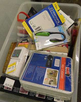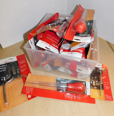 'Large box of new and carded kitchen collection tools incl. poultry lifting fork, meat thermometer etc.'